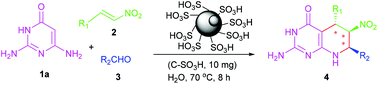Efficient and green domino approach for the synthesis of 5,6,7,8-tetrahydropyrido[2,3-d]pyrimidin-4(3H)-one derivatives using recoverable carbonaceous material as catalyst has been established. The new domino reaction was conducted by reacting readily available and inexpensive starting material of 2,6-diaminopyrimidin-4(3H)-one, nitroolefin and aldehyde in water. A total of24 examples were examined, and showed a broad substrate scope and high yields. The carbonaceous material catalyst can be reused at least 5 times without obvious deactivation. A proposed mechanism has explained the reaction process and the resulting highly chemo-, regio- and stereoselectivity. The present green strategy shows attractive characteristics such as using water as green medium, inexpensive and recoverable solid acid catalyst, simple work-up/purification and without generating any waste production or using any metal promoters.