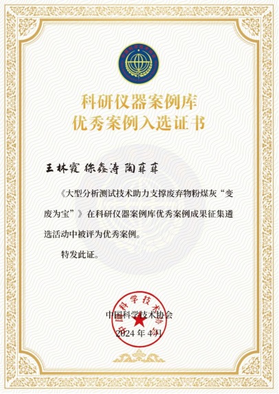 王林霞、陶菲菲及科学教育211班徐鑫涛团队申报的《大型分析测试技术助力支撑废弃物粉煤灰“变废为宝”》成功入选,被《科研仪器案例库》收录,并入选全国百篇优秀科研仪器案例。