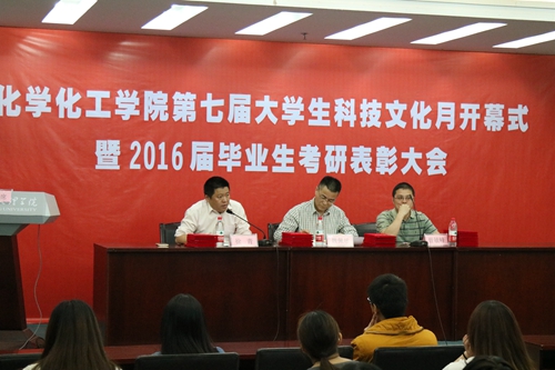 在图书馆一楼报告厅举行第七届大学生科技文化月开幕式暨2016届毕业生考研表彰大会。学院党委书记魏佩敏、副院长曾敏峰、党委副书记徐青、学生科副科长章江燕,2016届考研录取毕学生,2013级备战考研学生及各班学生代表共100余人参加了此次开幕式。开幕式由学院党委副书记徐青主持。