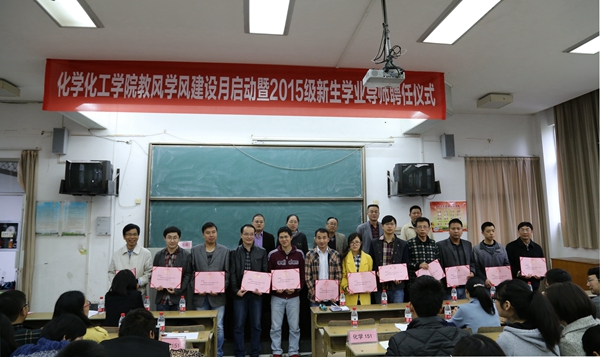 本科新生学业导师的通知》,并为新生学业导师颁发了聘书。聘任仪式结束后,新生学业导师代表苟发亮老师发言,分享了他的本科兼研究生导师曾给予他的帮助,并表示会为新生的成长发展提供力所能及的帮助,使每一位新生能够顺利并迅速地适应大学专业的学习。接着新生代表化学类151班吕心怡发言,她分享了教风学风建设月活动的开展,无手机课堂,新生学业导师制度的实施给同学们带来的帮助,并且呼吁同学们要持之以恒,同时也预祝“教风学风建设月”活动圆满成功。