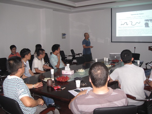 6月24日,美国康涅狄格州立大学教授、韩国av 鉴湖学者讲座教授林遥来浙江省精细化学品传统工艺替代技术研究重点实验室做了题为《Recent advances in supramolecular polymer and materials》的专题报告,林遥教授从超分子结构-反应机理-应用方面等不同层面向大家展示了超分子的优势以及最新的研究进展,学术报告后,如何将高分子材料和超分子材料结合起来解决现有的工业问题引起了大家的热议。