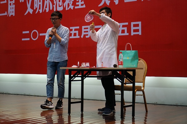 2014级研究生,在读期间科研成成果丰厚,共发表论文10余篇,其中SCI第一作者7篇,三篇文章影响因子超过7.0,有一篇影响因子超过8.0。杨超凡同学还申请发表专利一项。在今年的全国博士研究生入学考试中,杨超凡同学考入了复旦大学材料学专业,刘臣同学考入了江南大学化学工程与技术专业。杨超凡同学还获得了2017年校优秀毕业研究生荣誉称号。他们开创了我校独立培养研究生考取博士的先例。在展演中,他们生动有趣的互动和惊艳全场的化学魔术赢得了当晚在场师生的热议和好评。最终在微信投票和现场展示投票后,以总成绩第四名获得了此次“文明示范寝室”奖学金三等奖。