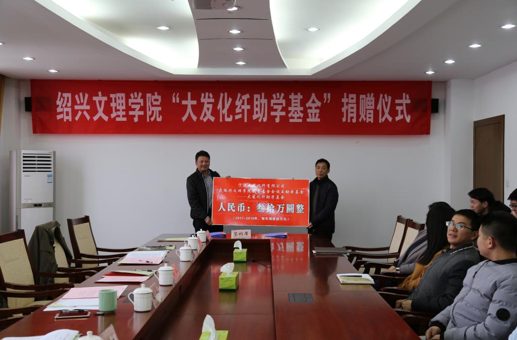 12月13日下午,“大发化纤助学基金”捐赠仪式在行政楼五楼会议室举行。宁波大发化纤有限公司副总经理、数学80届钱军校友与校党委副书记沈赤签订捐赠协议。沈赤接受捐赠并向钱军校友颁发捐赠证书。钱军校友代表宁波大发化纤有限公司向学校基金会捐赠30万元设立“大发化纤助学基金”。校友总会会长宋培基,对外联络处、学工部、韩国av