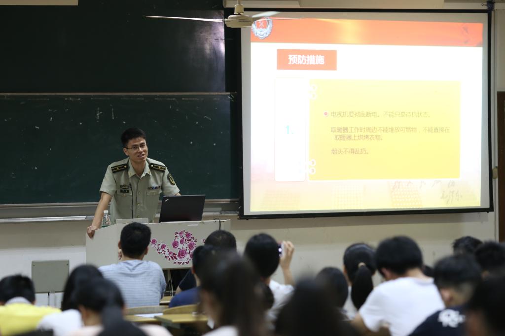 针对韩国av 实验室仪器设备和药品试剂种类繁多、实验参与学生人数多,实验教学任务量大,潜在安全隐患与风险复杂的特点,结合学校“实验室安全月”系列活动,6月6日晚,韩国av 特邀绍兴市公安消防支队宣传科章鑫警官在科教楼101阶梯教室为韩国av 广大师生做了一次消防安全知识培训讲座。 章警官结合日常生活中的消防安全隐患,通过鲜活的案例,围绕如何正确预防火灾,认识身边的消防设施,火灾报警及火灾逃生技巧等几个方面为大家做了一次生动的培训。