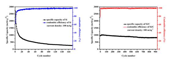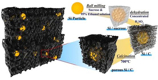 Si作为锂离子电池负极具有4200 mAh g-1的高比容量,是替代石墨碳负极使锂离子电池能量密度获得极大提升的最佳材料,也是使锂离子电池驱动电动汽车拥有超长续航里程的关键材料之一。遗憾的是,充电过程Si发生巨大体积膨胀(体积膨胀率~300%),严重影响材料和电极的结构稳定,从而恶化电池的循环性能。针对这一问题,本组提出了一种硅碳材料的简易制备方法:选择蔗糖及纳米硅,通过处理,利用硅与蔗糖间的氢键作用,得到硅@蔗糖;然后加入浓硫酸,利用蔗糖的脱水碳化,形成硅@多孔低聚物;最后,在惰性气氛下进行高温碳化,从而得到硅@碳复合材料。蔗糖脱水碳化可以将硅颗粒锚定在疏松的碳中,有效防止高温碳化过程中硅的团聚;高温碳化过程中,碳与残留的硫酸反应产生气体,有利于形成大量介孔。介孔碳可以为电子和锂离子提供更多的通道,缩短扩散距离;可以抑制硅锂合金脱锂后的团聚;硅在合金化过程中因体积膨胀产生应力,被挤出原碳孔,进入邻近碳孔中,不致于因粉化而失去电接触,使整体材料保持完整性,这可通过HRTEM等表征方法得到验证。该复合材料以100mA g-1的电流密度循环920次,容量保持率达85%以上。