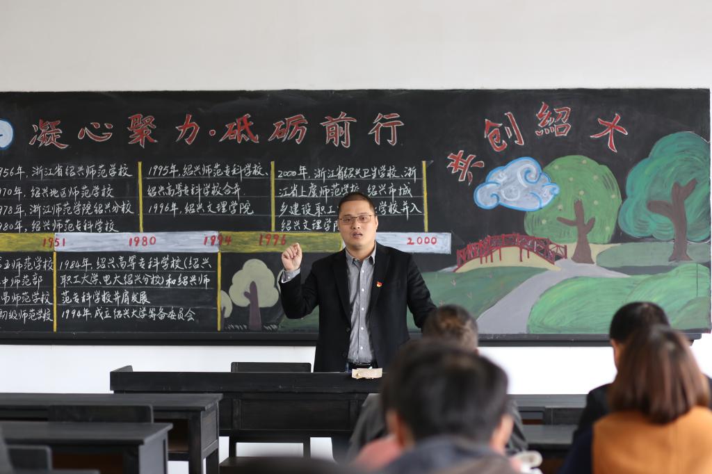的前身,在物质条件极度匮乏的宋六陵办学时期,全校师生攻坚克难、胼手胝足,培养了一大批优秀人才,开创了学校办学历史上的一段辉煌。学校校友办赵辅根老师介绍了攒宫校区厚重的历史,带领大家参观了校区建筑。在攒宫校区,学院党委书记魏佩敏、执行院长曾敏峰分别给全体教师党员上了一堂微党课,微党课围绕文理办学史展开,立足学院现实,擘画学院发展蓝图。习总书记曾讲过,一切向前走,都不能忘记走过的路;走得再远,走到再光辉的未来,也不能忘记走过的过去,不能忘记为什么出发。在学校更名设置绍大关键时刻,全体教师党员重温学校筚路蓝缕、传薪兴学的历史和责任,深度挖掘校园文化和办学精神,努力跑好创建绍兴大学这场承前启后、继往开来的“接力赛”。
