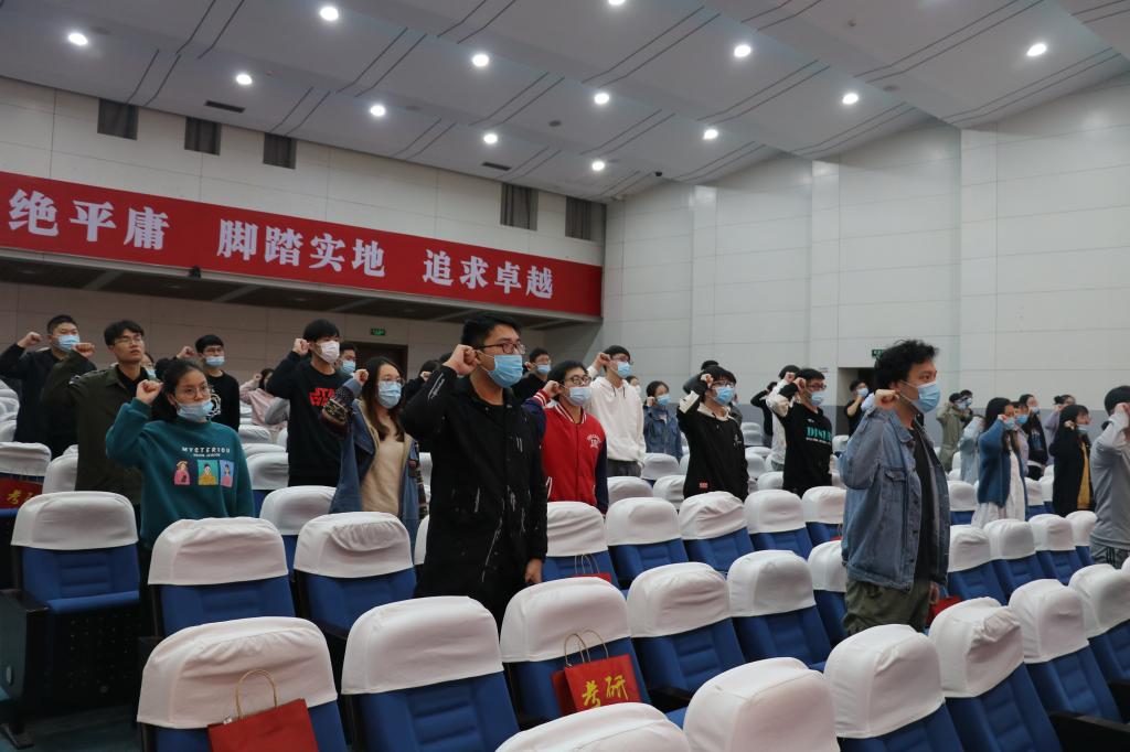 首先,执行院长曾敏峰围绕着“机遇、信心、务实、坚持、收获”五个关键词进行考研(博)动员,鼓励同学们以积极心态面对考研,要在务实与坚持中砥砺前行。随后,全体学生在张慧苗同学的领誓下进行了慷慨激昂的宣誓,庄严凝重的神情感染了会场上的每一个人,经久不息的誓词响彻会场。