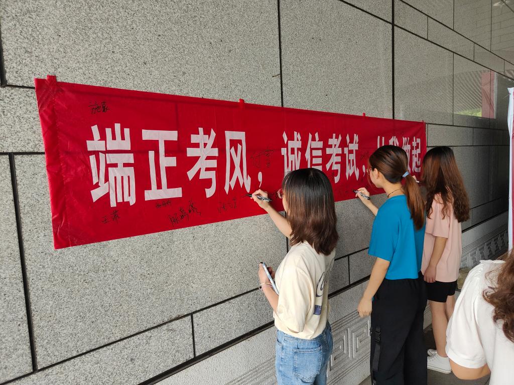 宣誓结束后,沈茹阳作为学生党员代表宣读考试诚信倡议书,倡议结束后,全体学生党员在“端正考风,诚信考试,从我做起”的横幅上签名承诺。