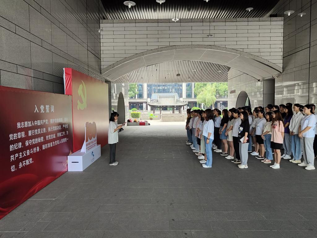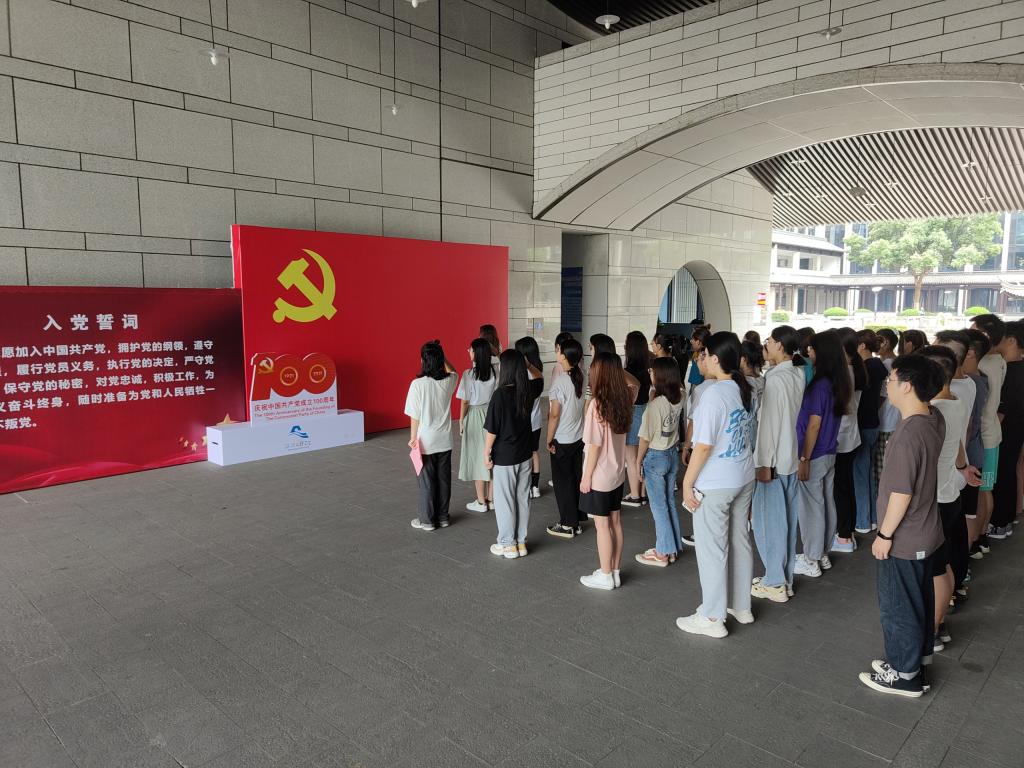 在集体入党宣誓前,学院专职组织员俞兰芳老师郑重地为新发展预备党员代表佩戴党徽,祝贺他们成为党组织光荣的一员。随后,由学生第二党支部党员王菲同志领誓,全体学生党员列队肃立,面向鲜红的党旗举起右手庄严宣誓。