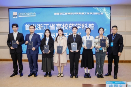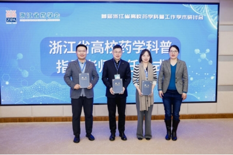 会议举行了授牌和聘任仪式。柳国庆为浙江省高校药学科普工作成员单位授牌。浙江大学药学院党委副书记杨慧蓉为浙江省高校药学科普指导老师颁发聘书。浙江省中医院/浙江中医药大学附属第一医院院长助理王建平为首批浙江省高校药学科普宣讲员颁发聘书。