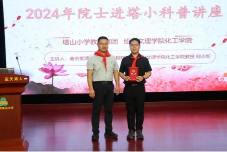 教授郁志新,化学系党支部书记刘海玲、副主任沈骐和塔山小学师生代表参加2024年院士进塔小科普讲座,并开展科学副校长聘任仪式。