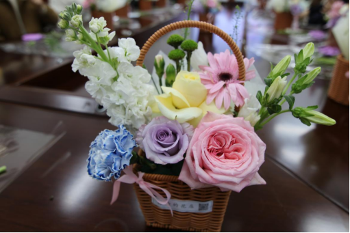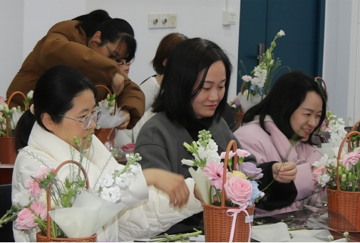 在轻松愉悦的氛围中,女教职工们充分发挥想象力和创造力,用心构思、精心搭配。她们手持剪刀,将原本普通的花枝进行修剪、整枝,再根据不同的色彩和形状错落有致地插入花篮。经过半小时左右的亲手实践,一盆盆错落有致、生机盎然、创意十足的插花作品逐渐呈现眼前。看着自己亲手创作的成果,大家脸上洋溢着幸福感和成就感,纷纷举起手机拍照留念,记录下这美好的瞬间。