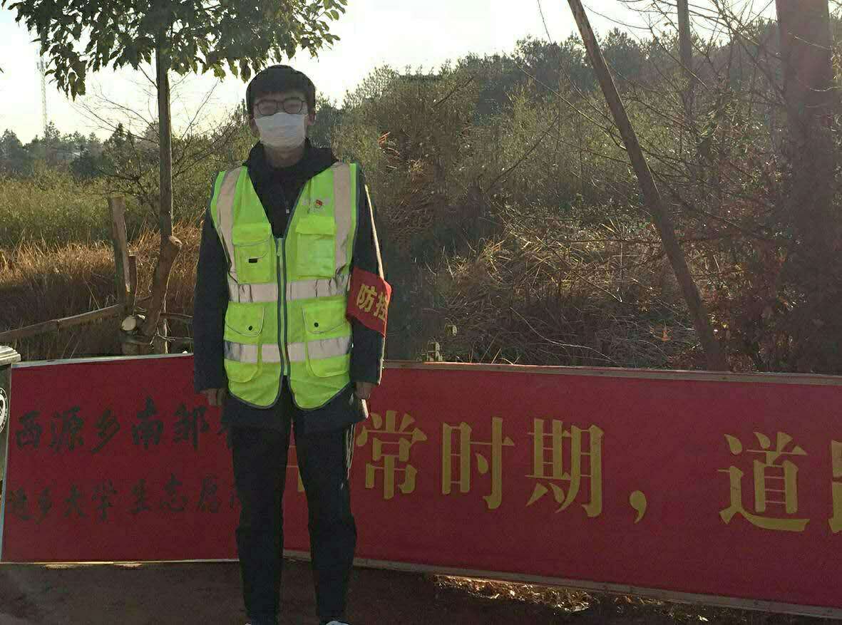 化学化工学院19级无机化学专业研究生郭森,他响应组织号召,参加抗击新冠肺炎志愿服务队,在村里唯一的出入口进行本地人员进出登记以及外来人员劝返等工作。他说:“村委工作人员和我们志愿者一起在这里守护全村人民的健康,全天24小时不间断执勤。在特殊时期,作为共青团员,向党看齐是我对自己的要求。�