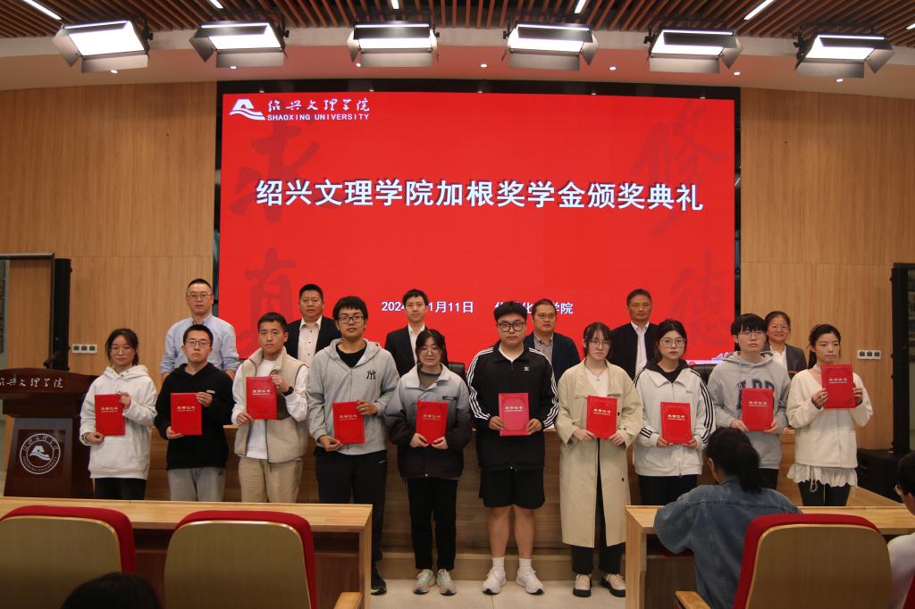 11�11日下午,绍兴文理学院�加根奖学��颁奖典礼在风则江大讲�107隆重举行。浙江闰土股份有限公司综合办副主任章峰,学院执行院长曾敏峰,党委书记徐青,副院长董华平、副院长刘雪松,获奖学生以及部分师生代表参加了颁奖典礼。典礼由学院党委副书记、纪委书记章江燕主持�