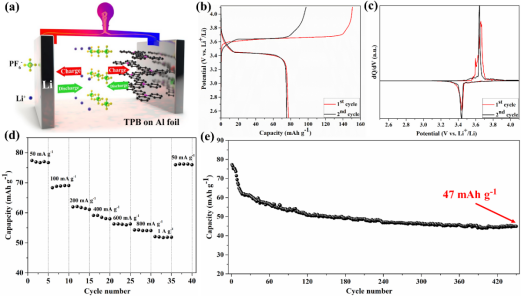 该论文的通讯作者为黄俊杰教授,我校为第一完成单位和通讯单位。本研究首次将电子共轭的N,N,N’,N’-四苯基联苯二胺用做双离子电池正极,实现了PF6-在材料中的嵌入/脱出,并利用谱学揭示了阴离子(PF6-)的嵌脱机理。