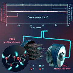 本研究报道了一种新型有机聚合物—聚离子液体,并首次应用于锂离子电池负极。本课题组选择N,N-二氰基咪唑型离子液体为单体,在高温下通过氰基在ab方向上的交联聚合制备一种多孔咪唑基聚离子液体。在嵌锂过程中,N原子和C原子可分别与Li形成N-Li键和C-Li键而实现储锂,实现Li0.5(C/N)的超锂化结构。与非离子型聚合物相比,咪唑正离子与Li+之间静电互斥作用促进了Li+的扩散,使其拥有优异的倍率性能。同时柔性的层状结构保证其大电流密度下循环的高容量保持率。这是聚离子液体材料在锂离子电池负极领域功能化的新尝试。