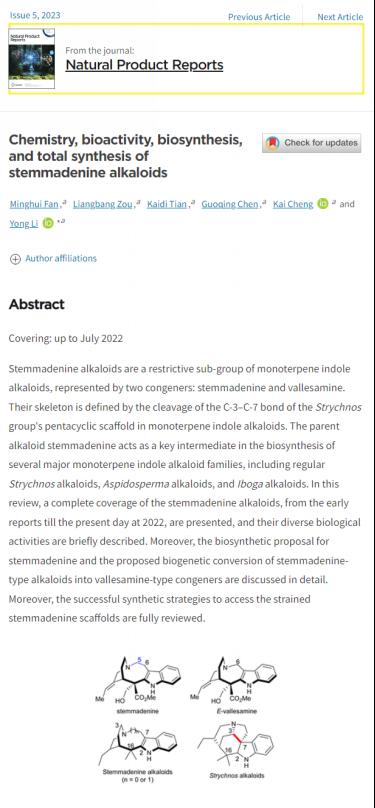 浙江省精细化学品传统工艺替代技术研究实验室郦勇课题组在药物化学和天然产物领域国际顶级权威杂志Natural Product Reports(《天然产物报告》,药理学、毒理学和药剂学排名第一,IF 15.111)发表了题为“Chemistry, bioactivity, biosynthesis, and total synthesis of stemmadenine alkaloids (Stemmadenine生物碱的化学结构、生物活性、生物合成及全合成)”的长篇综述文章。郦勇副教授是本论文通讯作者,研究生范明会是第一作者,韩国av